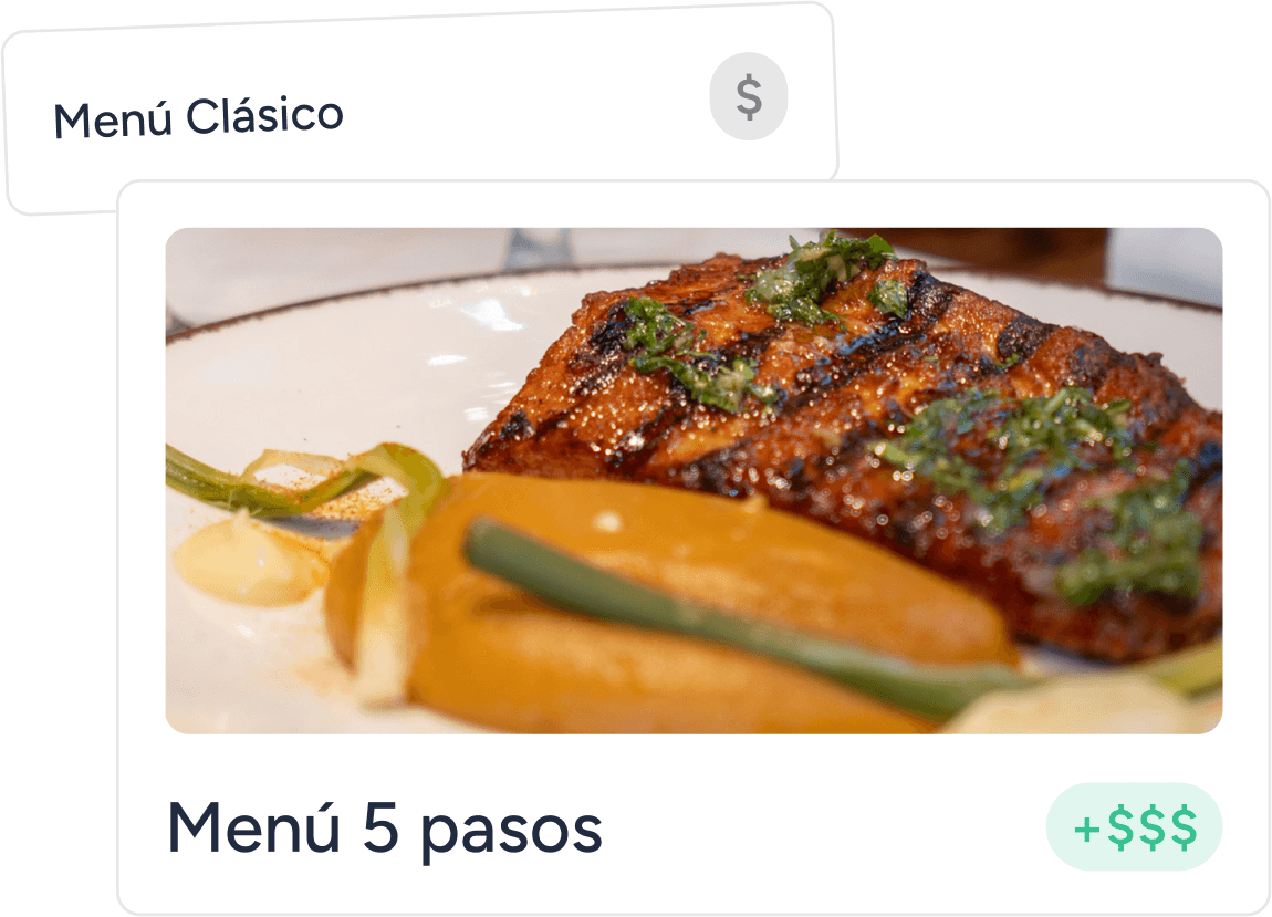 Desde la reserva, activá up-selling y cross-selling con propuestas atractivas de maridajes, vinos o merchandising. En solo dos clics, podés aumentar hasta un 15% el valor de cada mesa.