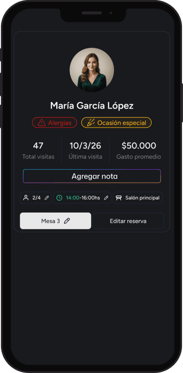Consultá reservas en tiempo real, accedé al historial, preferencias del cliente y tomá decisiones rápidas sin depender de una computadora